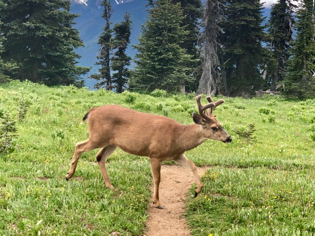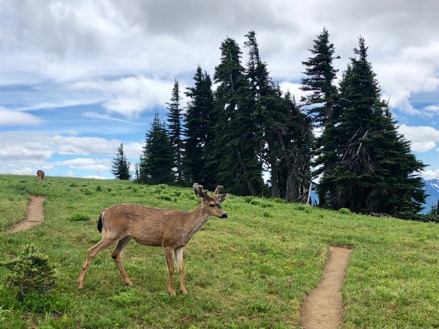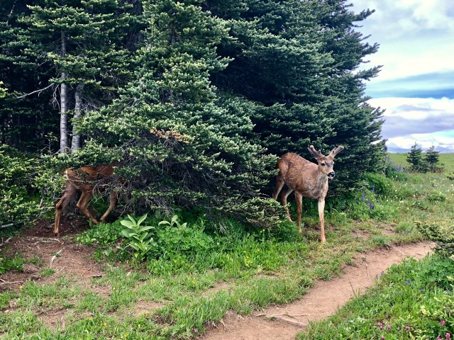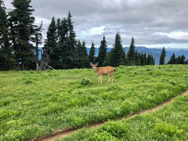 At the top of Hurricane Hill, we took a side trail westward across a beautiful meadow that – if I didn’t know it wasn’t the case – I would have thought had been planted and mowed. We sat and had lunch, watching two young Black-tail bucks graze nearby. They were soon joined by a third, then a fourth, then a fifth.