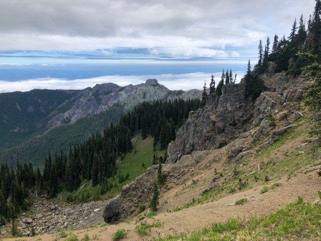 Here’s the view from near the start of the trail, looking north at Victoria on Vancouver Island which you could see if not for the cloud layer in the valley below: