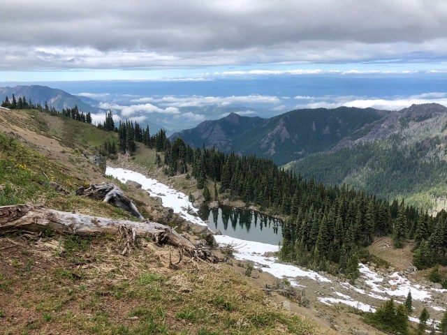 We eventually turned around and made our way back to the main trail and the overlook on Hurricane Hill. There’s still snow up there in mid-June, at least on the northern faces of the mountains (this view is to the northwest):