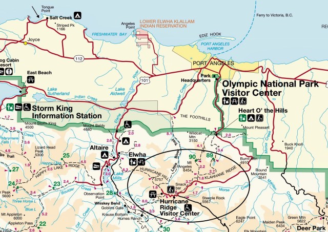 While we were camped at Crescent Beach for the week (map, below, top left at arrow), we drove through Port Angeles and up Hurricane Ridge Road several times, once visiting the main Olympic National Park Visitor Center to talk to the rangers about recommended hikes on the north side, and twice to go hiking from the Hurricane Ridge Visitor Center near the end of the road. The distance between the two visitor centers is 18 miles, a little over a 1/2 hour drive.