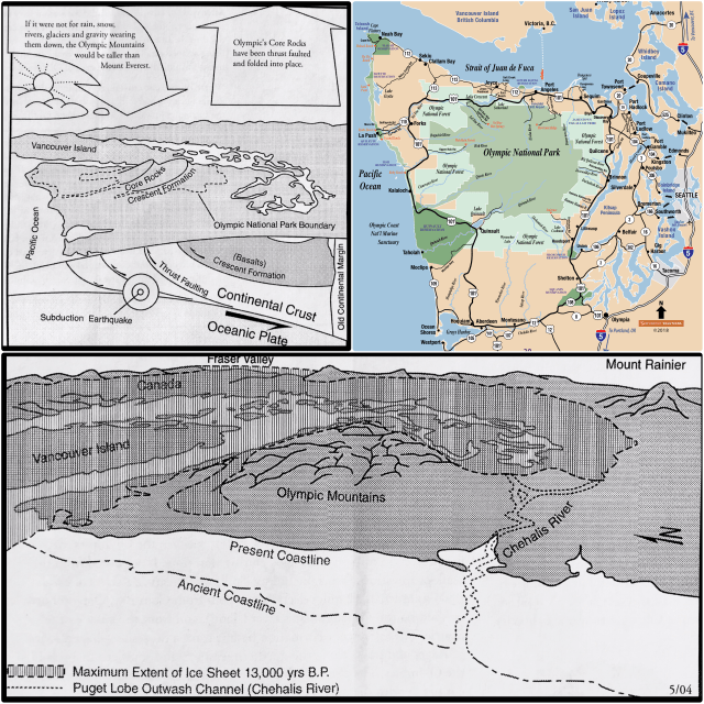 About 13,000 years ago, during the last Ice Age, an ice sheet descended from the north filling what is now Puget Sound and wrapping around the Olympic Peninsula (drawing, above, bottom), eroding some of the peaks and valleys as it melted and withdrew.