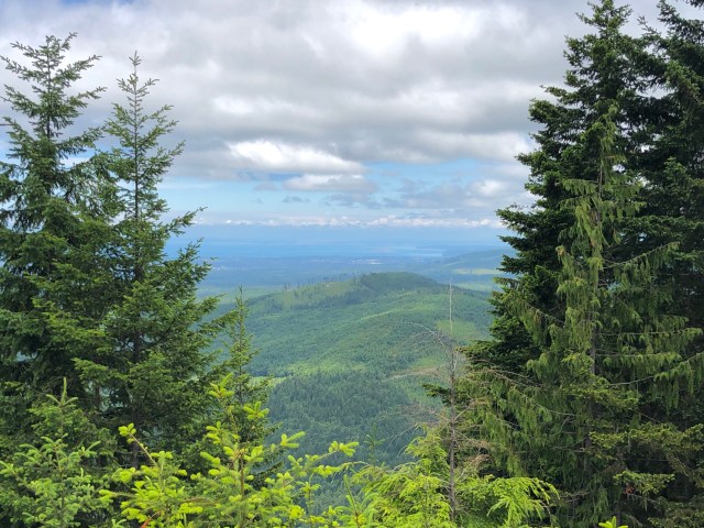 On the drive back to camp at Crescent Beach, we pulled over at a viewpoint. The town in the distance near the water’s edge is Sequim (pronounced “Squim”). Not visible in the photo, although I could see it at the time, is Mt. Baker, just poking above the low cumulus clouds in the distance, just east of our home in Bellingham.