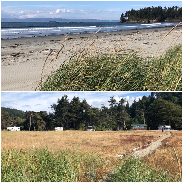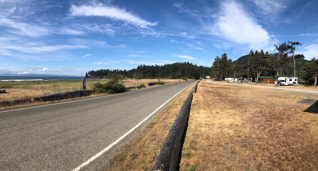 Back at the RV, I made one last trip out to the beach to watch one of the many unladen tankers that passed us go by. Battery 131 is up in those trees to the right; Vancouver Island is visible in the distance. I turned, and without moving, took a photo of our campsite.