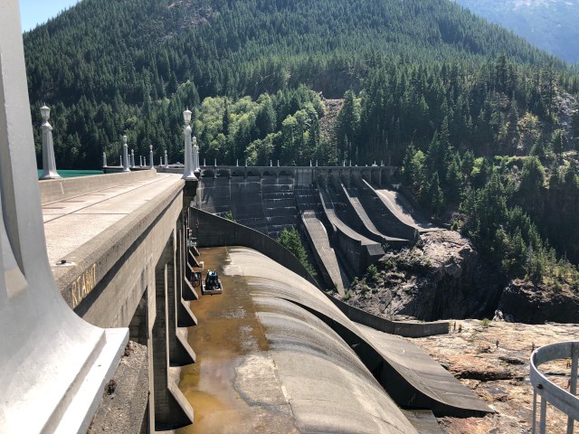 There are actually three dams in the Skagit River Hydroelectric Project, all owned and operated by Seattle City Light. Starting downstream at Newhalem and progressing upriver, they are: Gorge Dam (built 1921-23, on line in 1924 generating 208MW); Diablo Dam (1927-30, on line 1936, 190MW); and Ross Dam (1938-49, on line 1952, 450MW). Today, the three dams collectively produce nearly 1,850 megawatts of power hourly, which is more than twice as much as their original capacities and 20% of all the electricity used to energize the city of Seattle.