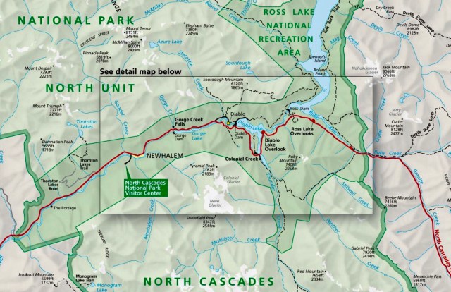 Seattle City Light also operates a ferry twice daily that runs the length of Diablo Lake. We caught the 8:30 a.m. ferry from Diablo Dam to Ross Dam, planning to hike back on the Diablo Lake Trail on the northern side of Diablo Lake, shown on the map, above.