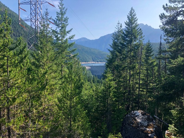 At a second power-line crossing, we looked back to see Ross Lake Resort and Ross Dam: