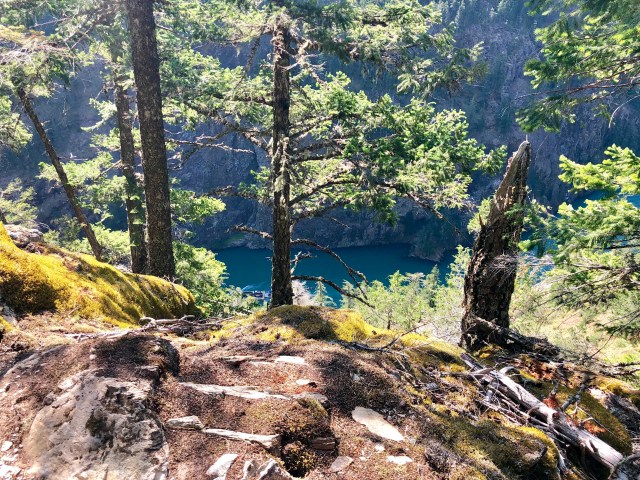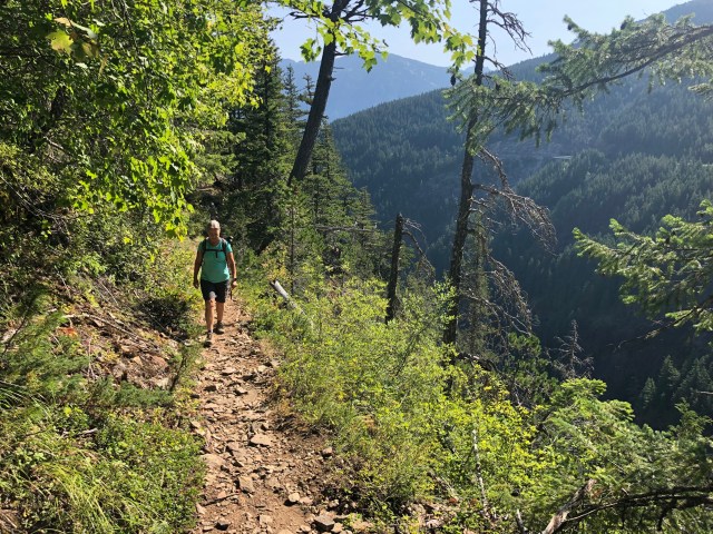 The Diablo Lake Trail begins with a fairly strenuous switchback ascent of 1,500 feet, about a third of the way up Sourdough Mountain. The trail then heads southwest along the side of the mountain at that elevation, crossing the power-line leading up from the Ross Lake power plant.