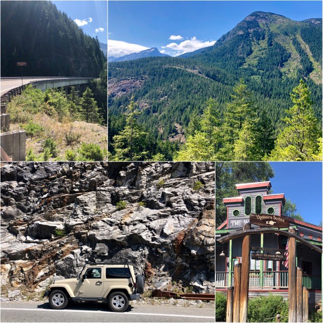After returning to the RV for lunch, we drove east on WA-20 to Winthrop for an early dinner. On the way, we stopped at the Horsetail Creek bridge (photo, below, top left) and looked across the valley to see where we had hiked that morning on the side of Sourdough Mountain (top right):