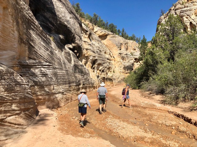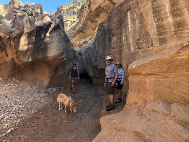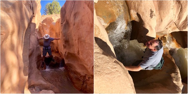 Willis Creek canyon is about 10 miles south of Cannonville on a combination of paved, gravel and dirt roads. There’s a dirt parking area at the trailhead and a sign describing the hike, reminding hikers to stay hydrated, and warning about flash floods in the canyon, proclaiming in big letters: “You Could Die Out Here”!!!