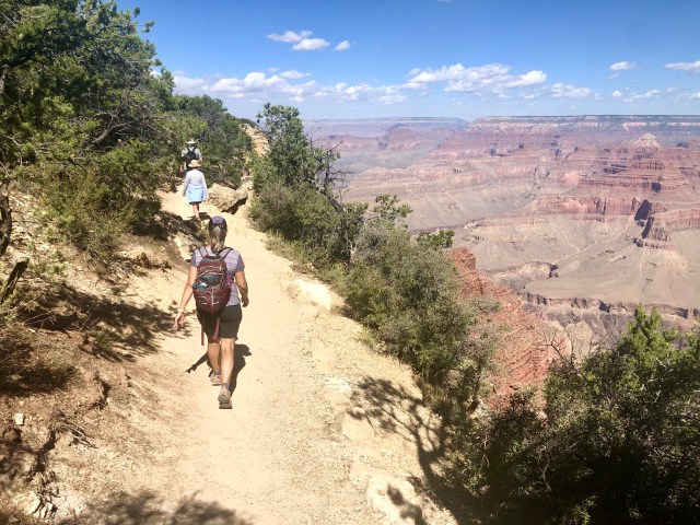 Our first day’s hike started directly above the beginning of the Bright Angel Trail. Down in the valley, at the end of that flat plateau, we could just make out the trail to Plateau Point off in the distance.