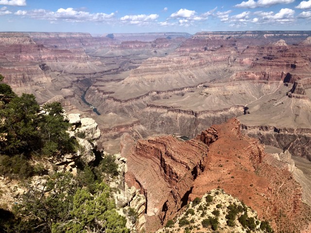 It is generally believed that the Grand Canyon was carved out of the Colorado Plateau by the Colorado River about 6 million years ago. As I mentioned, above, the elevation of the South Rim of the Grand Canyon is 7,100 feet above sea level. The Colorado River is currently at an elevation of about 2,000 feet, nearly a mile below the canyon’s rim.