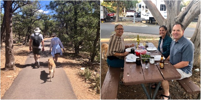 At the Grand Canyon, we checked into Trailer Village RV Park (red circle at “Mather” on the map, below). Lucky for us, our site turned out to be just a short walk from where Jim and Von were staying. After getting settled, we all met up at the local bar & grill for dinner to plan our two day stay on the South Rim.