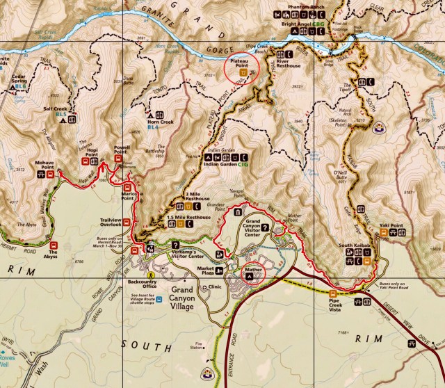Anyway, back in the present, we decided to hike the Rim Trail in two sections: the west half on Sunday (with Daisy) from Grand Canyon Village to Mohave Point; and, the east half on Monday from our lodgings to the Kaibib trailhead with stops at the Yavapai Geology Museum and the Visitor’s Center (our hikes are highlighted in red on the map, below). Each of these hikes would be 5 miles walking distance along the canyon’s rim at elevation 7,100 feet.