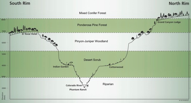In between the South Rim and the Colorado River there are four distinct biotic communities: Ponderosa Pine Forest at the top (where we would be hiking); Pinyon-Juniper Woodland, a transition zone; Desert Scrub down at Indian Garden/Plateau Point; and a Riparian habitat down at the Colorado River. The North Rim, being 1,000 feet higher – and, therefor, cooler – has a fifth community, a Mixed Conifer Forest.