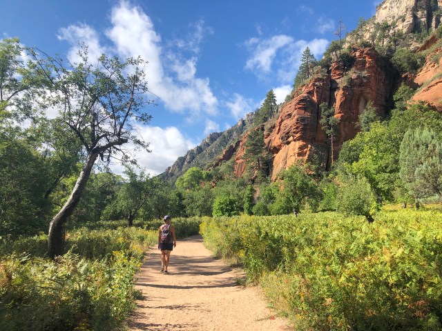 One of the hikes that the ranger recommended was West Fork Trail #108, about 15 miles north of town on scenic US Highway 89A. We decided to do that one ourselves on this trip, saving the more typical mesa and Red Rock trails closer to town to hike with family in November.