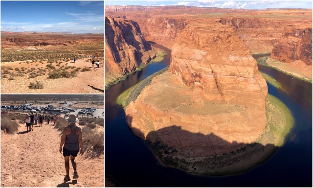 Until recently, Horseshoe Bend overlook was relatively unknown, but photos of this scenic and dramatic bend in the river went viral on social media and the place is now swarming with tourists and tour buses. Although there weren’t too many visitors when we arrived (photo, below, top left), the place was inundated with tourists when we left (bottom left).