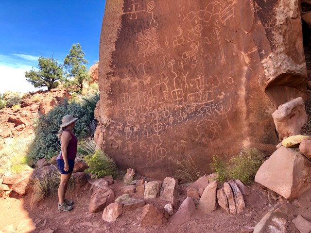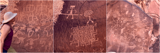 … that is, human-like images and animal forms, such as bighorn sheep, deer and mountain lions, and geometric patterns. The name for the site, “Maze Rock Art,” comes from the prominent maze pattern shown up high on the rock (must have been a tall Indian).