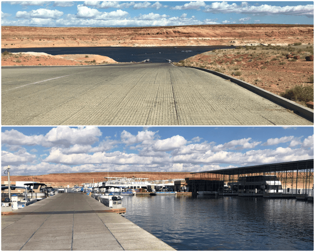 Lake Powell is a boater’s paradise. It has what could possibly be the world’s longest boat ramp (photo, below, top). For those without their own watercraft, there are a number of outboard motorboats and houseboats available for rent in the marina.