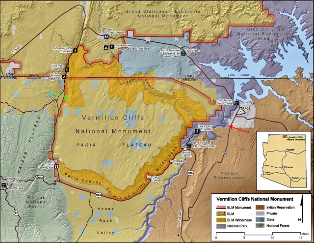 The land upon which the town of Page was built (in grey on map below) was acquired through an exchange with the Navajo Indian tribe whose reservation encompasses all the lands east of the Colorado River in this region (in brown). On the west side of the Colorado River is the Vermilion Cliffs National Monument and Wilderness. And sandwiched between those two (in purple) is a sliver of the Glen Canyon National Recreation Area which incorporates Lake Powell.