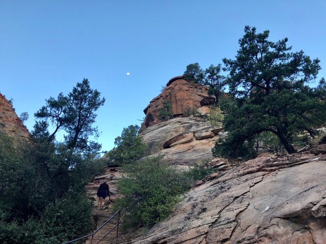 We were up early our first day to drive through the tunnel to the Canyon Overlook trailhead at the east end of the tunnel. The moon was still in the sky as began our ascent.