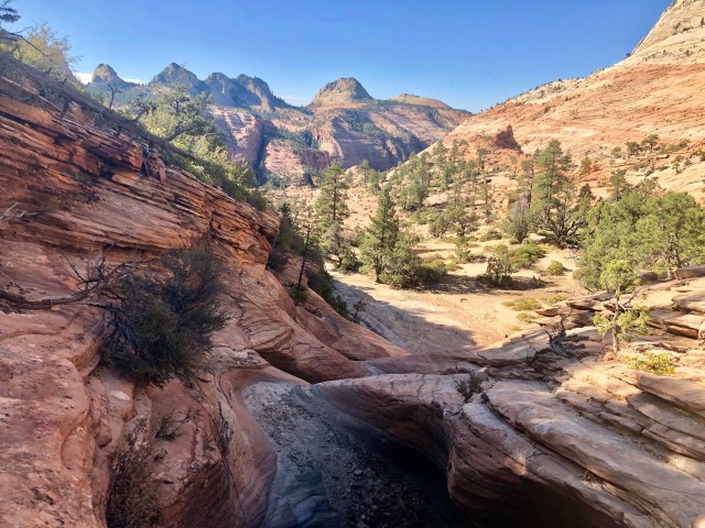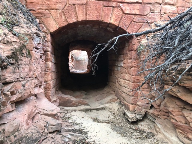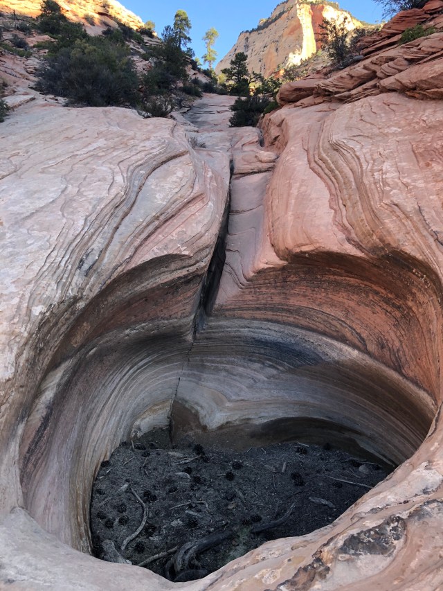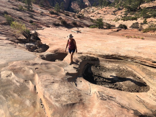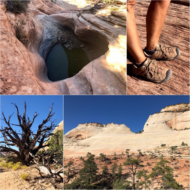 We admired the view, then made our way back to the Jeep, continuing east on UT-9 to a turnout on the south side of the road and the unmarked trailhead to the Many Pools Trail. That trail winds down into a (currently) dry drainage, then passes under the road through a box culvert that is probably full of water in the springtime.