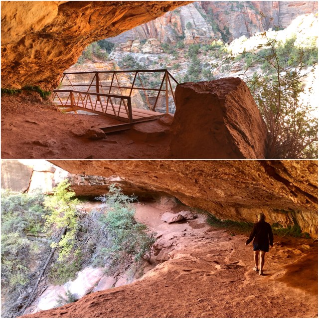 The Canyon Overlook trail skirts along cliff walls, at one point on a catwalk where the ledge is nonexistent, guiding us into a cavernous “grotto” where water leaking through the stone, coupled with the reflected morning light, is sufficient for plants to grow (look beyond Dale in the lower photo where the wall joins the floor).