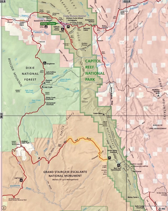 Here’s a map of the Loop; I’ve highlighted in yellow that section of the Burr Trail Road that was removed from the Grand Staircase-Escalante National Monument in 2017: