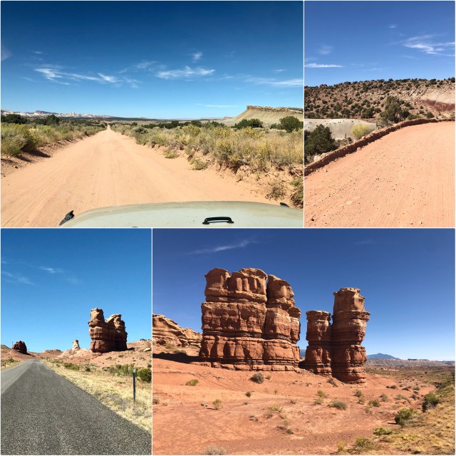 We continued north with Oyster Shell Reef to our east (photo, below, top left – the Reef is on the right). Near the north end of Notom-Bullfrong Road, we pulled off the road for a final time to look at a handful of solitary hoodoos (bottom).
