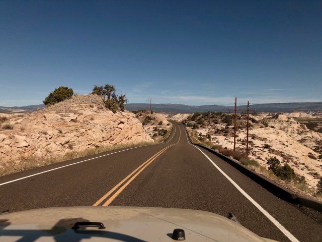 Heading north from Escalante on Scenic Byway UT-12 toward the little town of Boulder (pop. 225), the road climbs past the trailhead to the Lower Calf Creek Falls, then continues over the “Hogback” (more on that later).