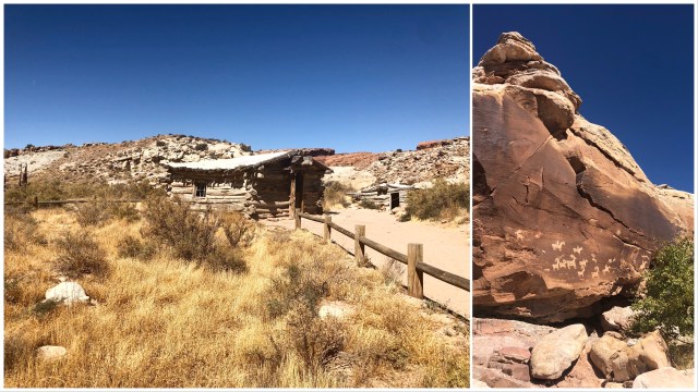 Just behind the cabin, carved into the sandstone, are petroglyphs depicting big horn sheep and horses with riders. Since horses were not introduced to this area until the mid-1600s, these petroglyphs were most likely carved by members of the Ute tribe, not by the earlier Anasazi or Fremont Indians.