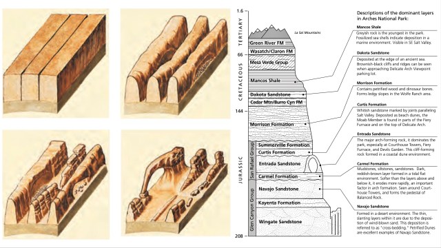These and other scenic rock formations have been carved principally from four Jurassic-ages strata: the Navajo Sandstone, the Dewey Bridge Member of the Carmel Formation, the Slick Rock Member of the Entrada Sandstone and the Moab Member of the Curtis Formation. Geology Unfolded, p. 8