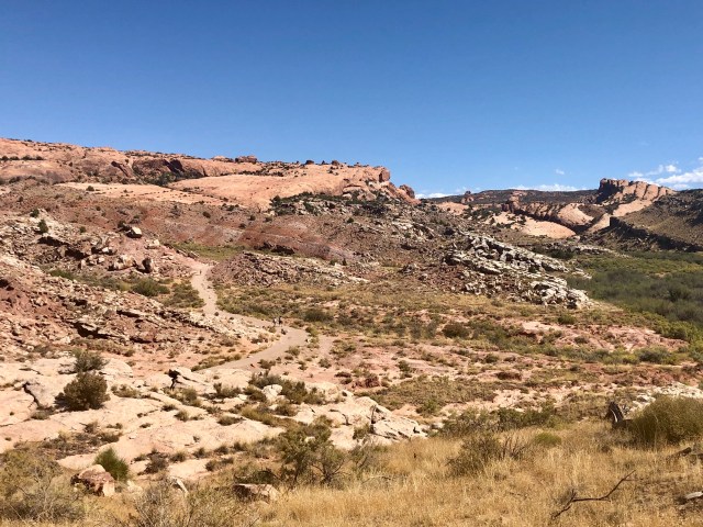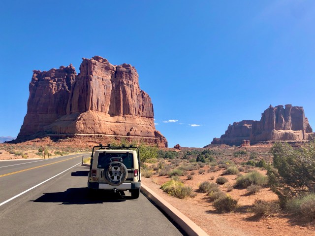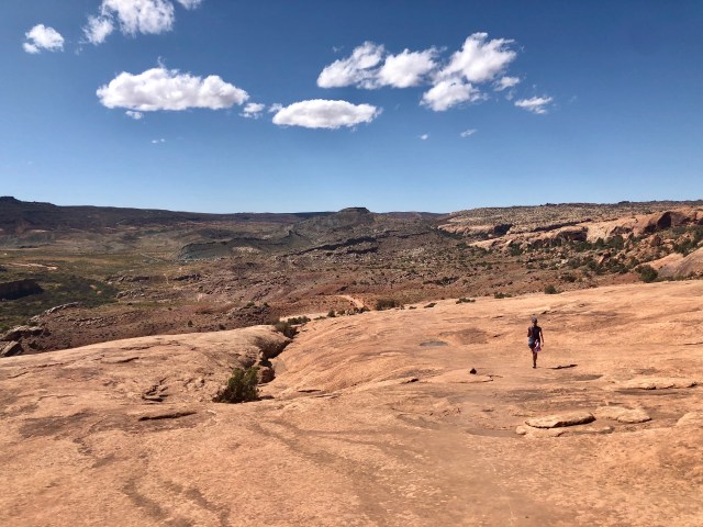 It’s a little over 150 miles to Moab from Torrey where we had camped while exploring Capitol Reef NP and environs: east on UT-24 to Hanksville; continue on UT-24 northeast to I-70; east on I-70 to US-191; then south on US-191 to Moab. With the exception of I-70, the entire drive is 2-lane roads, many miles of which have minimal swales.