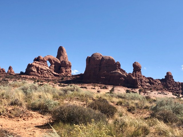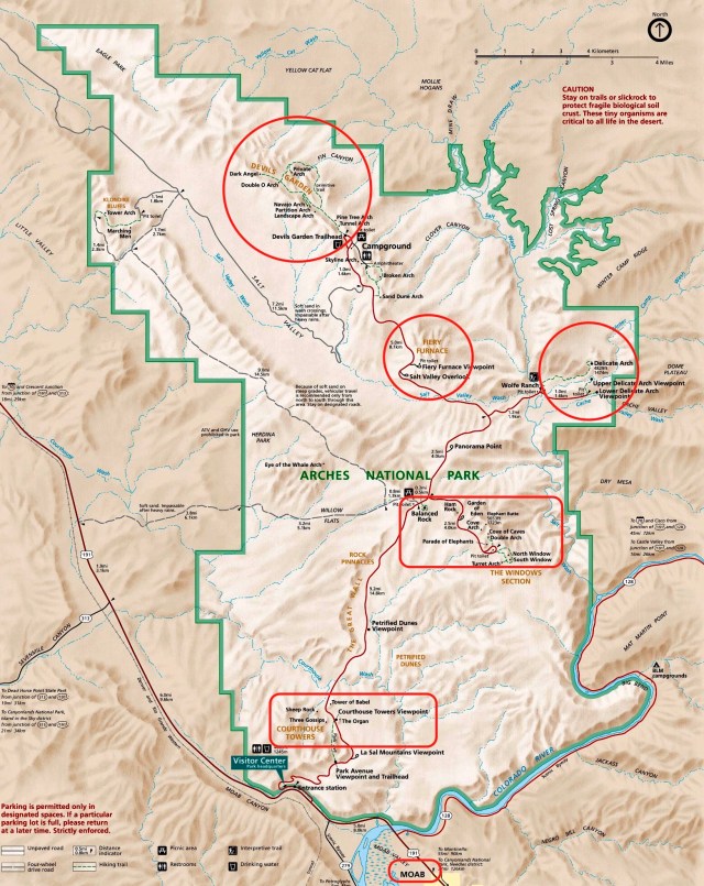 Could be. I’ll reserve judgment until we’ve seen the others. At any rate, after Delicate Arch, we drove around the Park to see some of the other sights, most of which are visible from the road. On the Park map, below, I’ve circled the areas we will hike; the rectangles are areas that we saw from the road: