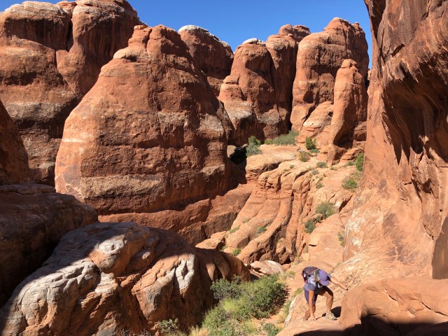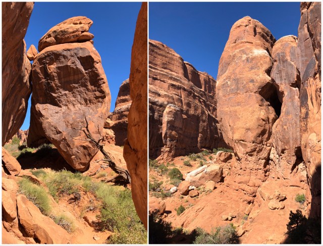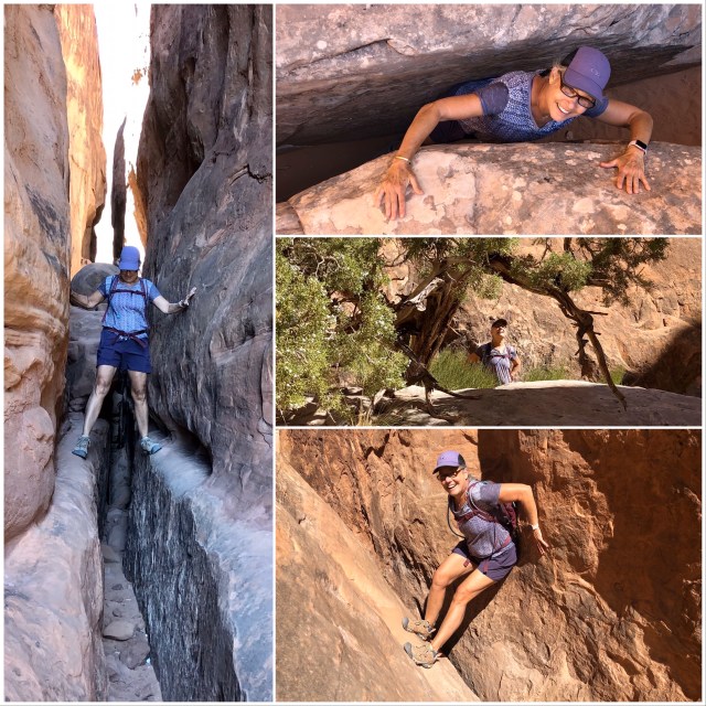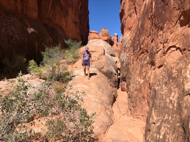 There were unmarked trails running every-which-way, many to dead-ends, as well as worn trails in the rock and a few steps cut into the sandstone. As we hiked up between two fins, I stopped to take pictures,…