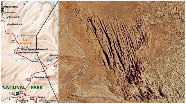 In a previous post, I discussed how fins are formed as a result of rising salt domes cracking the strata. Here the fins are more extreme because Fiery Furnace sits at the edge of a salt dome (“Salt Valley Wash” on the map, above, left) which dissolved and was washed away eons ago, resulting in its collapse and an even more complete fracturing of the surface.