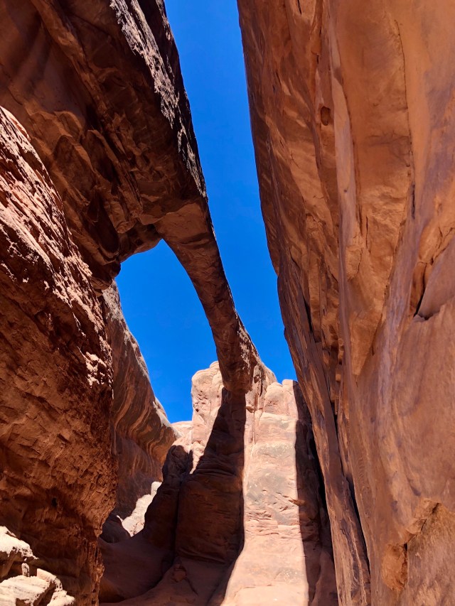 We wandered up and down the slot canyons, slipping and sliding from one to another, discovering the occasional arch or crevice as we explored (I later learned that the arch, below, is called Surprise Arch).
