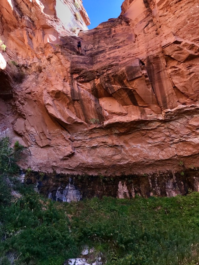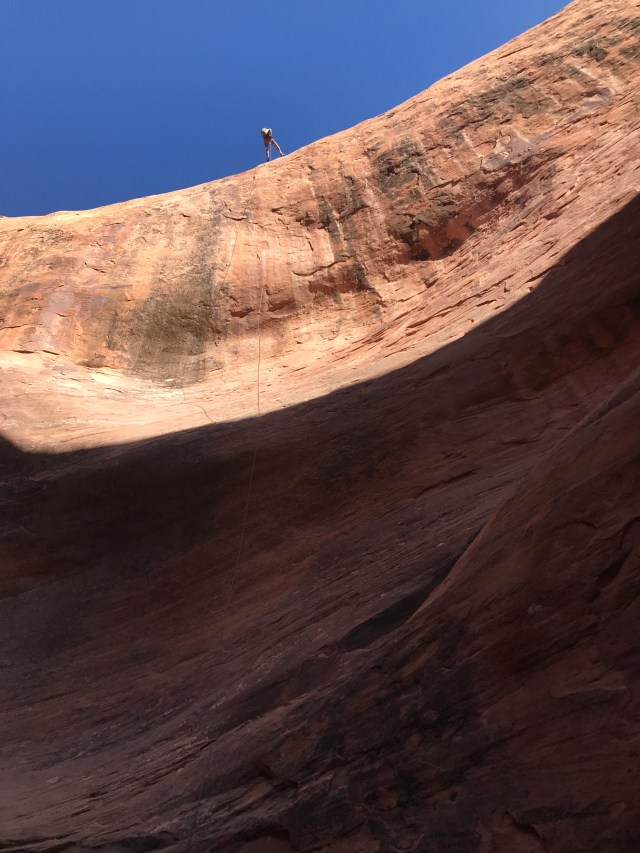 Next up, Dakota. Notice there are two ropes: a top-rope, fed through Dakota’s ATC (Air Traffic Controller) and then dropping down below him to the canyon floor; the other, a blue rope (a top belay) clipped onto his harness and eased out by Alex during Dakota’s descent.