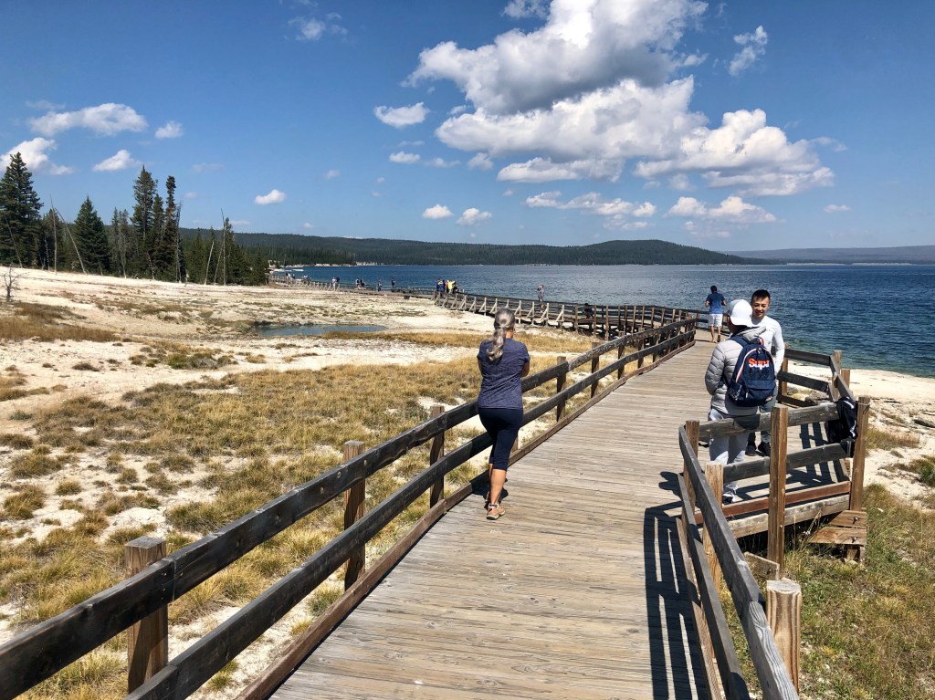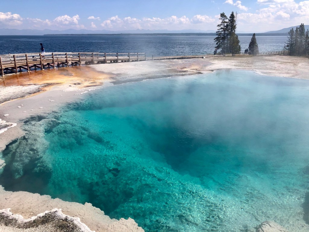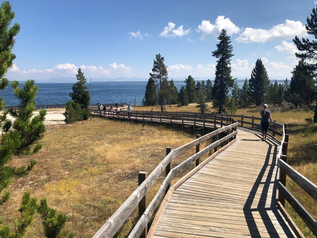 The road to Old Faithful from Bridge Bay Campground follows the shoreline west, turning inland at West Thumb, a hydrothermal area like that surrounding Old Faithful, created by a more recent eruption 174,000 years ago – a caldera inside a caldera. From the parking lot at West Thumb there’s a boardwalk through the geyser basin to the lake.