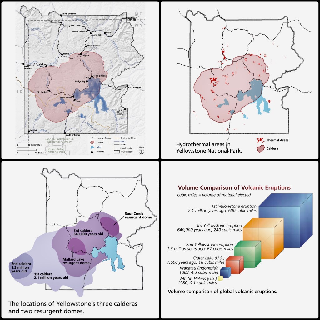 As I mentioned, above, the heart of Yellowstone NP is a huge caldera formed by an ancient volcanic super-eruption 640,000 years ago. Actually, that eruption was only the most recent resulting from the super-volcano located here; there were two others, one 1.3 million years ago, and the largest of all 2.1 million years ago – their footprints and the volume of ejected material are illustrated, below.