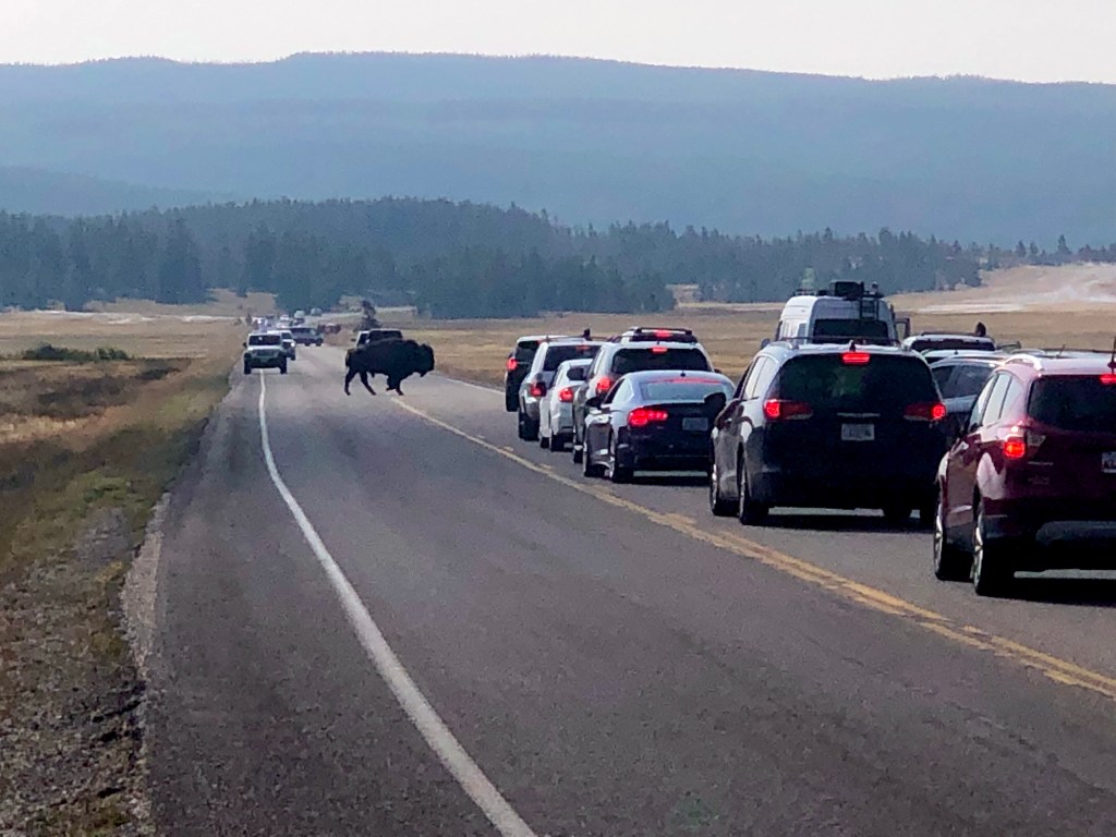 We headed back past Old Faithful from the campground at Bridge Bay, bound for Mammoth Hot Springs at the northern entrance to the park, some 90 miles distant. [Our route for the day is shown in dark yellow; entry and exit from the park in light yellow.] On the way, we encountered a relatively common sight here in Yellowstone: