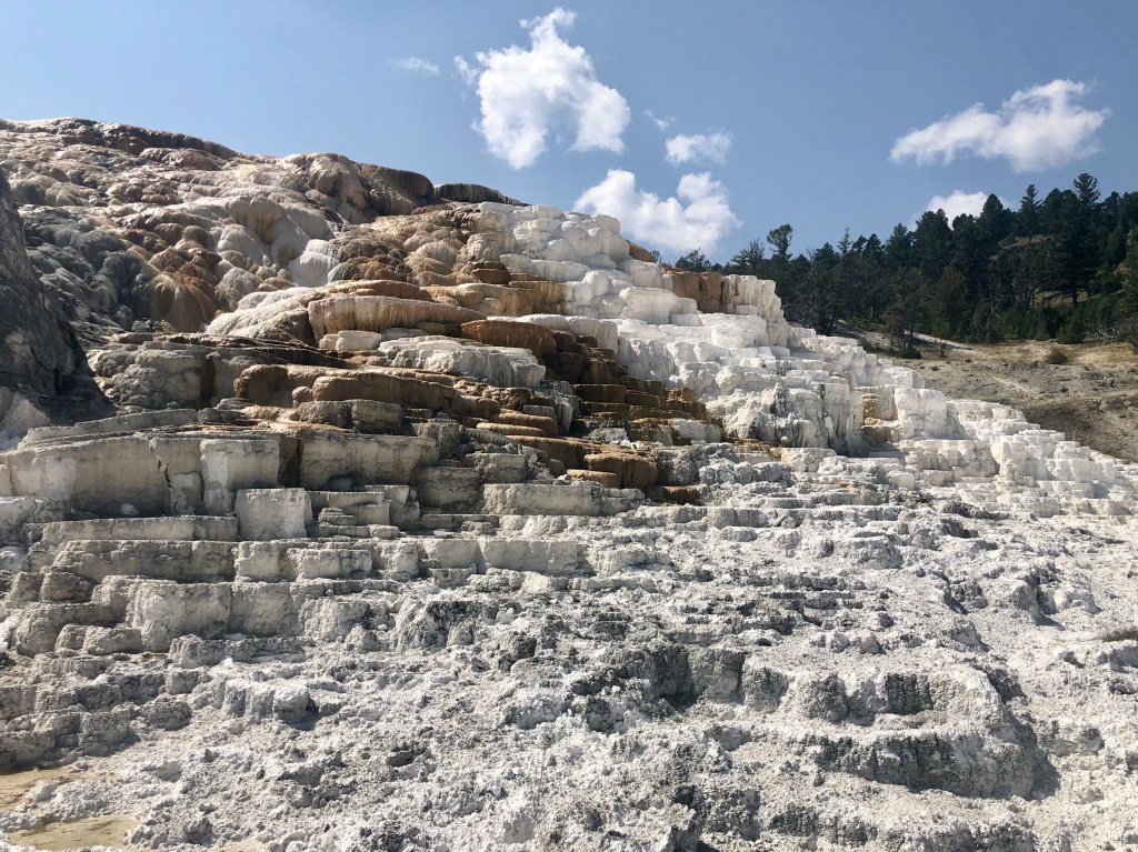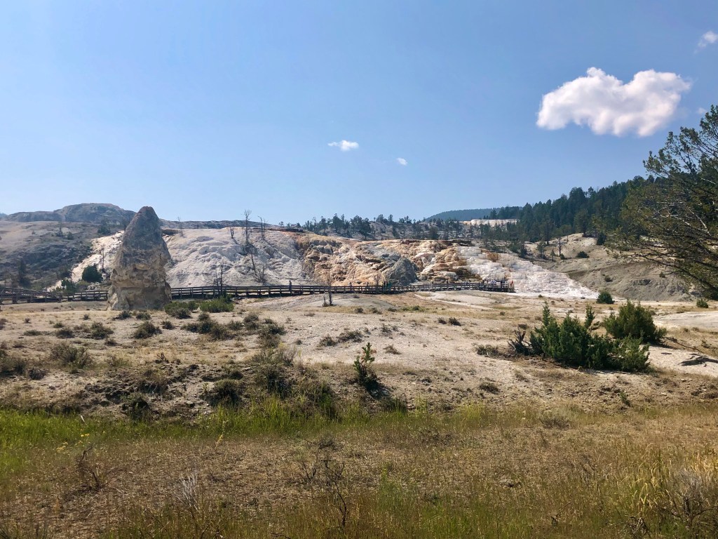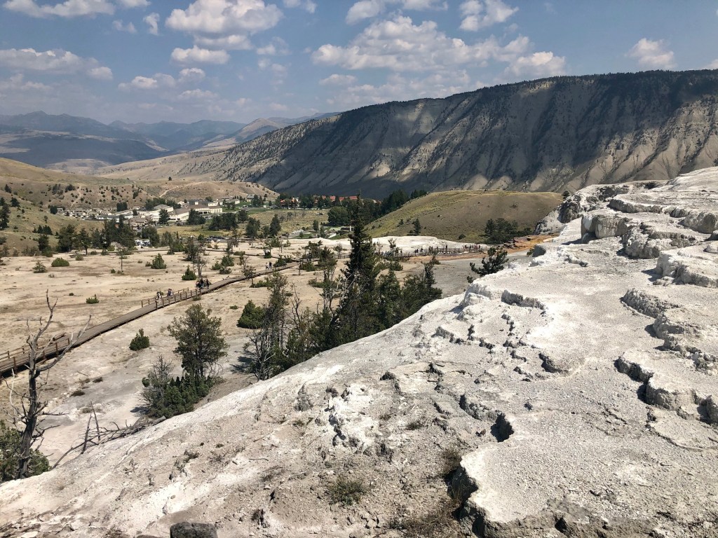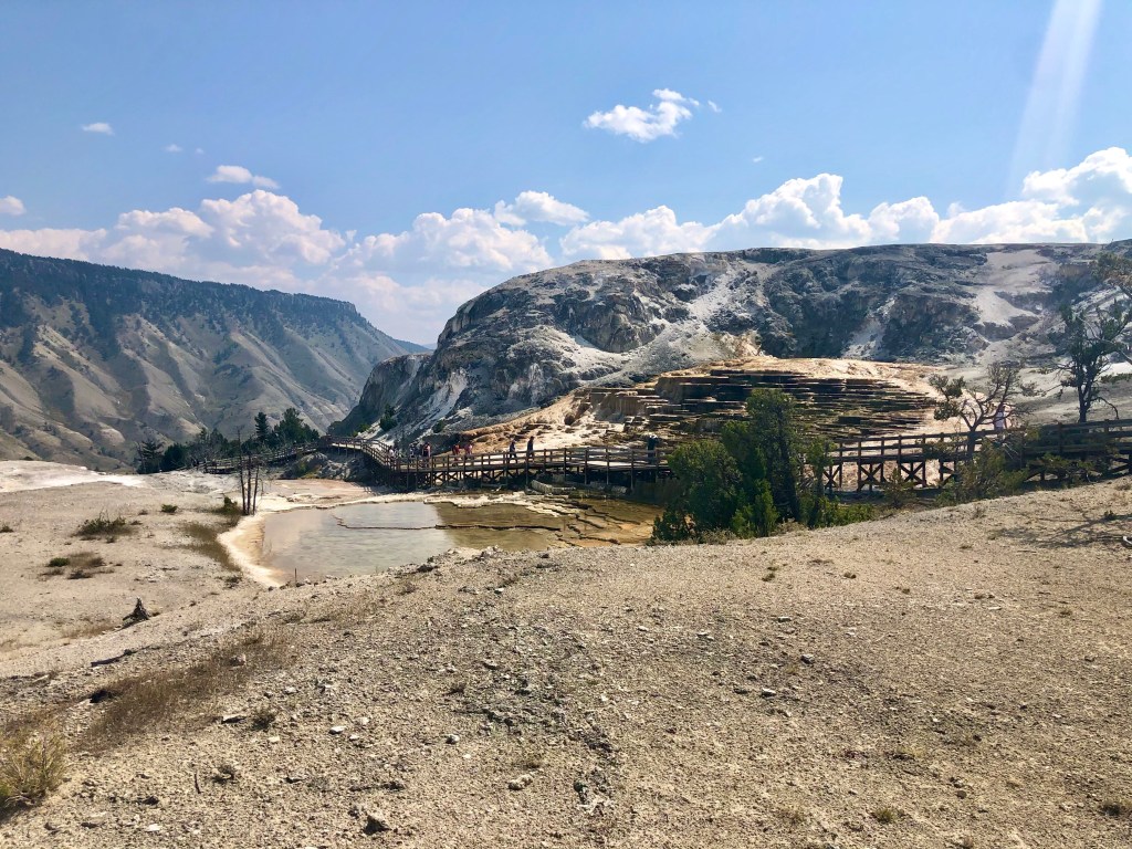 With traffic and occasional stops for wildlife, it took about two hours to drive from our campsite to Mammoth. After parking and grabbing a quick picnic lunch, we headed off to walk the boardwalk through the Lower Terraces of Mammoth Hot Springs.