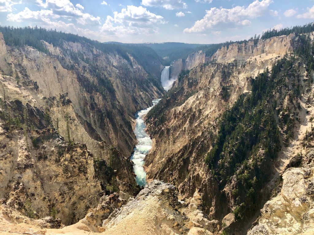 The headwaters of the Yellowstone River are found in the adjacent Absaroka Mountains from which it flows into the southeast corner of Yellowstone NP, then north into Yellowstone Lake from which it continues north to where it has carved its Grand Canyon over the last 150,000 years or so. The falls you see in the photos above and below are of the Lower Falls, a 308 foot drop. The Yellowstone River was explored by Lt. William Clark (of Lewis & Clark fame) in 1806 on his return from the Pacific. The river continues north from the park into Montana, then west across that state to North Dakota, parallel to I-90 and I-94, the route that we, too, will soon follow.