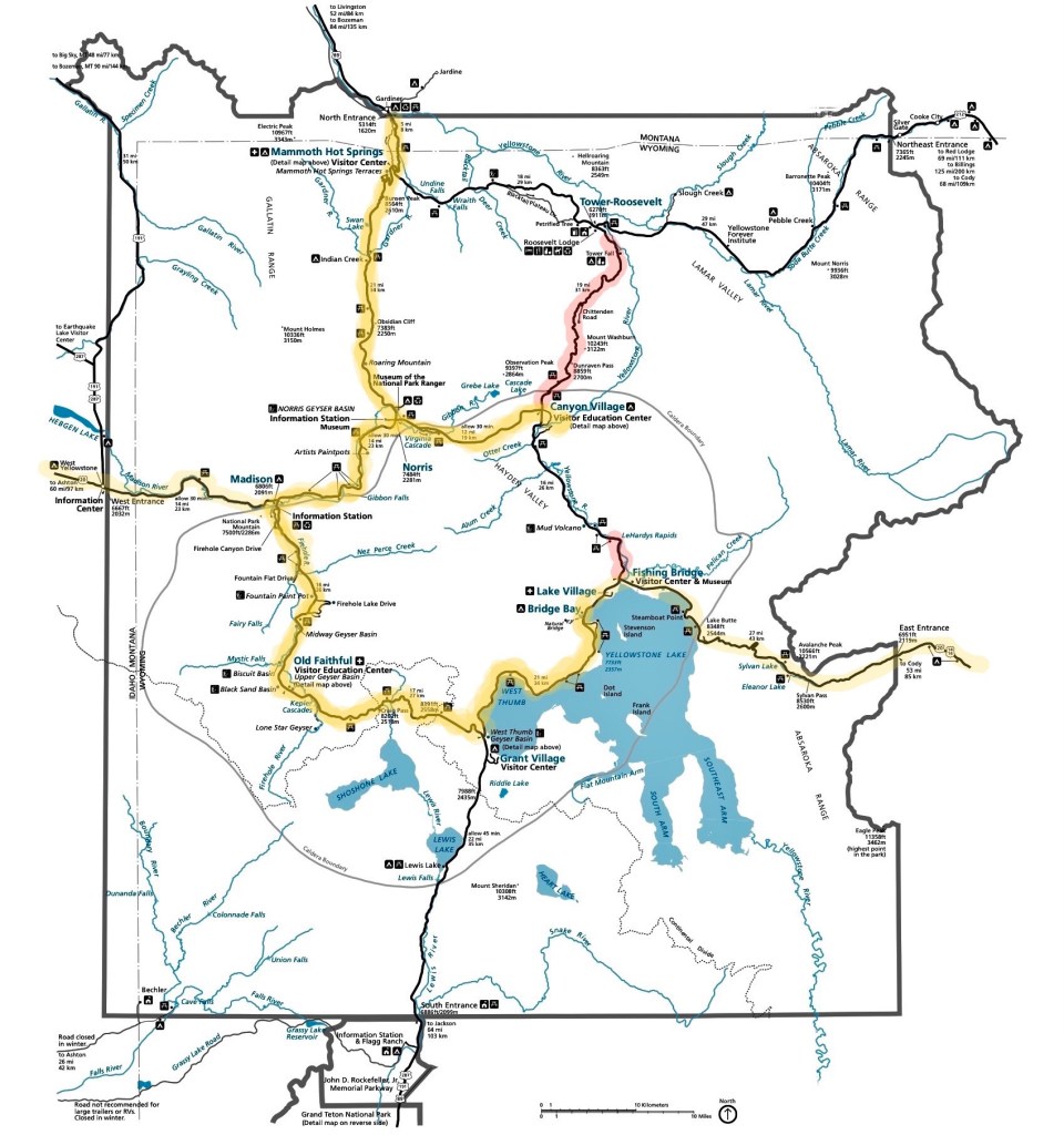 We were informed upon entering the park when we first arrived that the road from Canyon Village to Tower-Roosevelt was closed for the year for maintenance and that there had also been an unexpected closure of the road between Canyon Village and Fishing Bridge due to an overturned fuel truck and the environmental clean-up that accident had made necessary. [Road closures are shown in red on the map, below.]