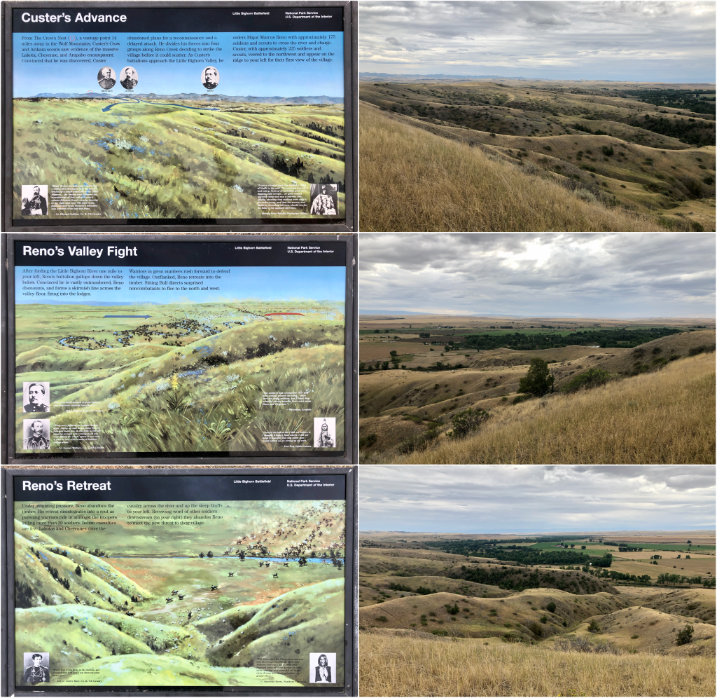 Most people stop at the visitor center, park and walk around Last Stand Hill, then drive Battlefield Road to its end, turn around and leave (that is, they travel left to right on the map, above). But the fighting here unfolded in the opposite direction. So, in order to really understand what happened here, it’s best to drive to the end of Battlefield Road first for a walk there, then drive back and finish with a walk around Last Stand Hill.