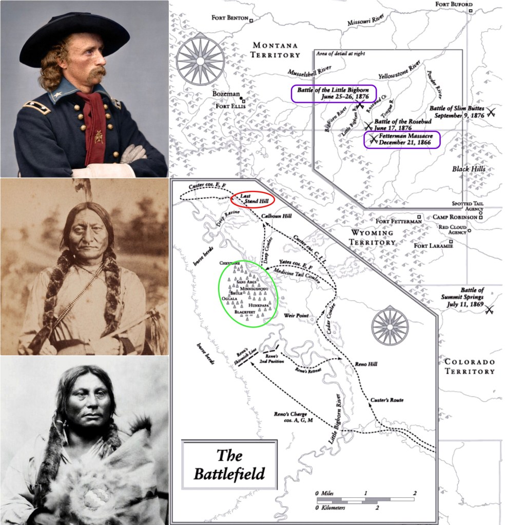 Sheridan’s plan seemed to go sideways from the beginning. Gen. Gibbon was delayed crossing the Yellowstone River and Gen. Crook was attacked and repelled by Crazy Horse at Rosebud Creek to the south where he went into bivouac. Gen. Terry, concerned that any delay might result in his approach being discovered by the Sioux with sufficient time for the Indians to decamp and escape, authorized Lt. Col. Custer (below, top) and his cavalry to ride ahead and attack, if necessary, in Custer’s discretion.