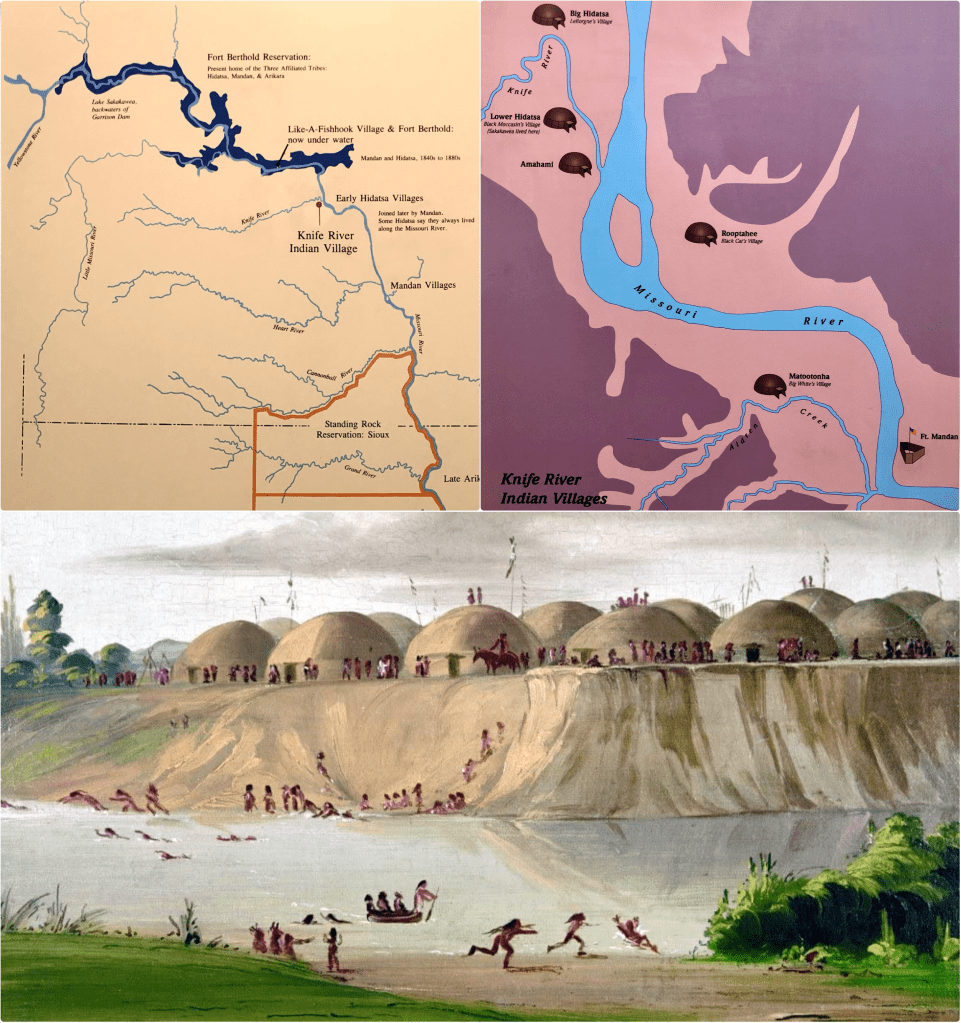 Depicted below is the Lower Hidatsa village, also known as Awatixa, home to about 400 Hidatsa Indians living in some 50 earth-lodges built along the banks of the Knife River, as it existed in 1832 when it was visited by the artist George Catlin.