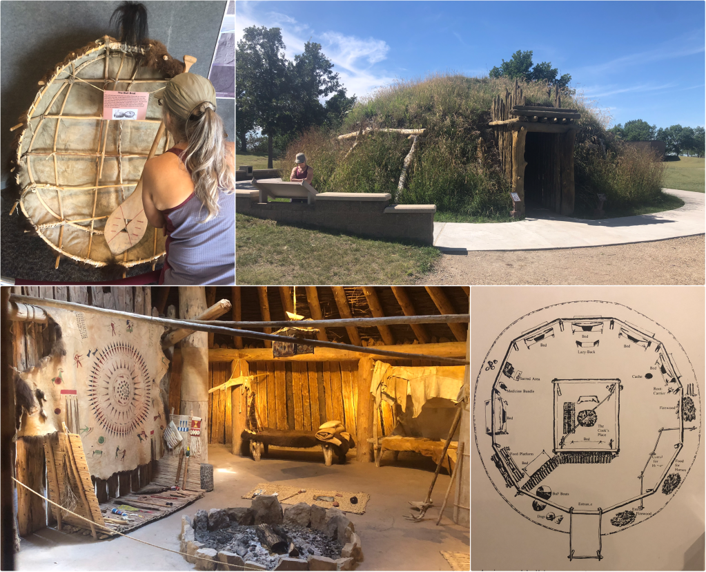 Before making our way down to the village site, we stopped to visit the displays in the small NPS visitor center (including a bull-boat, similar to the basket boats of Vietnam) and a reproduction of an earth-lodge dwelling. These lodges were built and “owned” by the women of the tribe, inherited through the matriarchal line. Because the four main uprights were buried in the ground, thus rotting over time, the lodges had to be taken apart and reassembled every 7 years. Each lodge accommodated about 10 residents with raised beds around the periphery and a central cook-fire, vented through a hole in the roof that could be covered with a bull-boat in the event of rain.