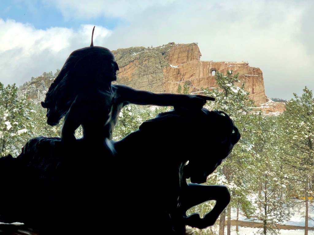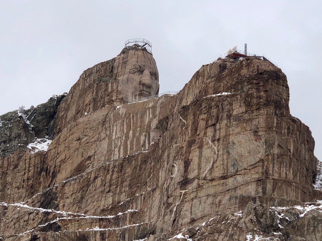After visiting Mount Rushmore, we drove over to see the Crazy Horse Memorial, a private endeavor dedicated to the Oglala Lakota Sioux war chief, Crazy Horse. I say “dedicated” because the carving does not depict Crazy Horse since his likeness was never recorded for posterity and nobody has any idea what he really looked like. The visionary for this project was another Oglala chief, Henry Standing Bear, who recruited the sculptor Korczak Ziolkowski in 1940 to design and carve the monument. Here’s the sculptor’s model with the on-going work visible in the distance: