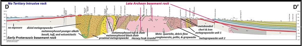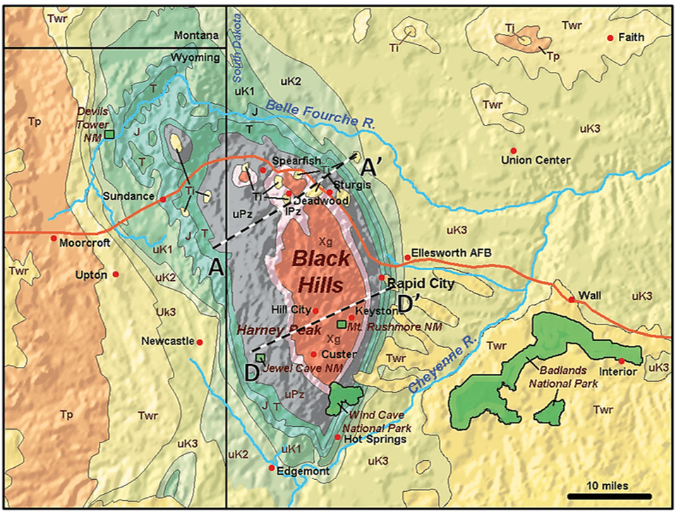 The Black Hills appear as an island in a sea of prairie grass, rising 3,000 feet above the surrounding plains. The Hills, which measure approximately 125 miles N/S and 65 miles E/W, are considered the easternmost extent of the Rocky Mountains. The formation’s granite core (red area, map, below) is approximately 2 billion years old, pushed toward the surface by volcanic uplift 60-70 million years ago and exposed since then by erosion. Moving away from the core, the rock layers are progressively “younger.” Surrounding the core is a ring of limestone (grey area), then a ring of soft, red shale, followed by hard Dakota Sandstone (see cross-section D-D, below).