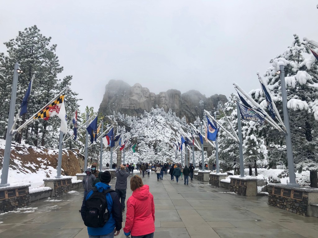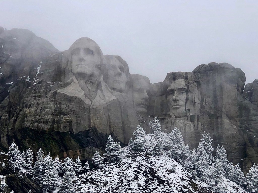 That afternoon, as the snow abated, we went to see Mount Rushmore. When we first arrived, low clouds and fog completely obliterated the famous faces of the presidents. We stood at the viewing area for about 20 minutes, but the visibility wasn’t improving, so we went back to the concessionaire to see if we could get some coffee or hot chocolate. Wandering back outside, we noticed that the presidents were just starting to peek through the mist: